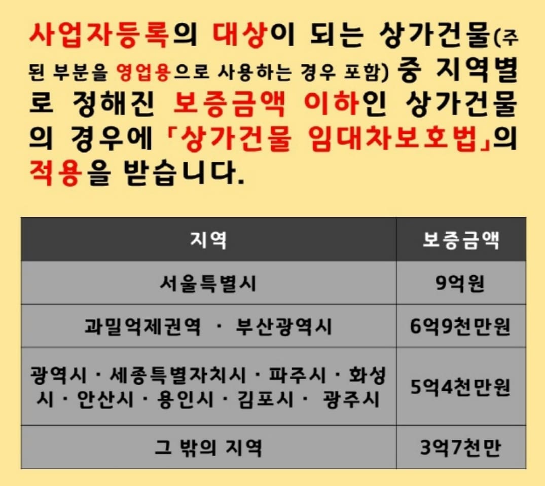 '상가건물 임대차보호법'은 지역별로 일정 보증금 이하의 상가건물 임대차에만 적용돼요.