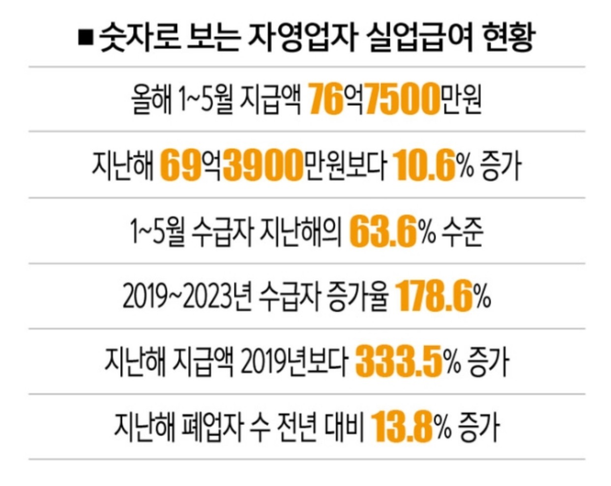 76억 7500만 원. 올해 1~5월 자영업자 실업급여 지급 총액입니다.