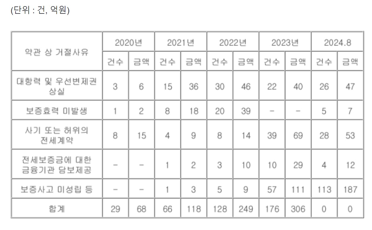 올해 전세보증 이행 거절 사유를 따져보면 '보증사고 미성립 등'이 113건으로 64%를 차지한다.